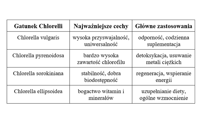 Różnice między gatunkami nie są ogromne, ale dla niektórych użytkowników mogą być ważne. Chlorella vulgaris ma lepszą przyswajalność i sprawdza się jako suplement ogólnego zastosowania. Chlorella pyrenoidosa wyróżnia się wyższą zawartością chlorofilu i mocniejszym działaniem oczyszczającym. Odmiany sorokiniana i ellipsoidea najczęściej wybierane są przez osoby, które poszukują produktów o szczególnie wysokiej jakości lub chcą wprowadzić do diety algi o bardziej zróżnicowanym profilu odżywczym.