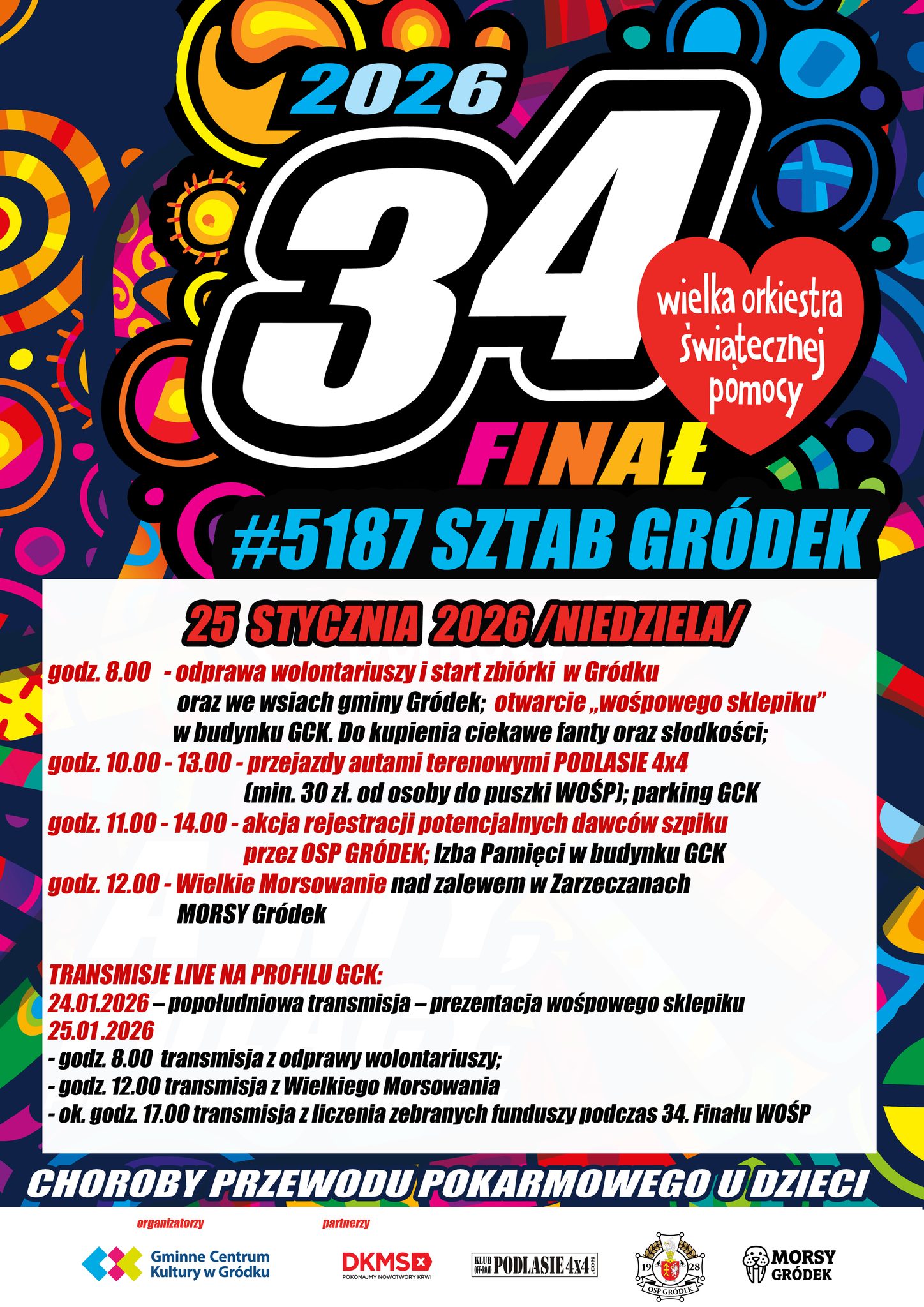 godz. 8.00 - odprawa wolontariuszy i start zbiórki w Gródku oraz we wsiach gminy Gródek; otwarcie „wośpowego sklepiku" w budynku GCK. Do kupienia ciekawe fanty oraz słodkości;