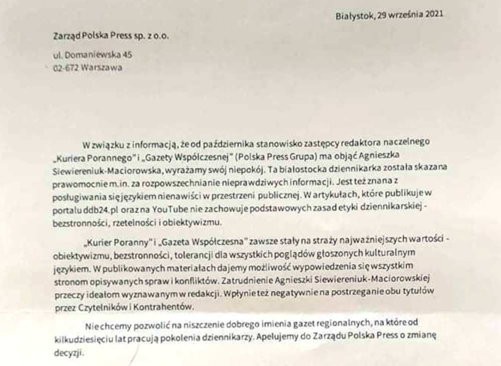"Dziennikarze białostockiej redakcji grupy Polska Press (Kurier Poranny, Gazeta Współczesna) protestują przeciwko zatrudnieniu w redakcji Agnieszki Siewiereniuk-Maciorowskiej, znanej jako redaktor naczelna serwisu Dzień Dobry Białystok, a także ekspert i komentator życia politycznego i publicznego, między innymi w takich środkach przekazu jak Telewizja Publiczna, Telewizja Republika itp. W proteście, 29 września br. pracownicy białostockiego oddziału PPG [Polska Press Grupa - przyp. red.] napisali list do zarządu firmy, wyrażając swój sprzeciw wobec zatrudnieniu wyżej wymienionej osoby. Jest to osoba, która nigdy nie pracowała jako dziennikarz. Przez 6 lat prowadziła swój twór Dzień Dobry Białystok, który jest małym i mało znaczącym serwisem internetowym, o czym świadczy np. oglądalność kanału YouTube. Pod apelem podpisali się praktycznie wszyscy dziennikarze oddziału i niemal wszyscy pracownicy innych działów. Skutek wysłania pisma do zarządu był tragiczny dla redakcji. Niespodziewanie, bezpodstawnie, ze swoim stanowiskiem zmuszony był pożegnać się zastępca redaktora naczelnego, który podpisał się pod listem i stanął murem za zespołem (był związany z redakcją przez 20 lat). Miał chwilę, by spakować rzeczy i opuścić redakcję. Do zwolnienia doszło w sposób, jakiego nigdy nie praktykowano w białostockim oddziale. To trudny czas dla pozostałych pracowników, którzy żyją pod presją i każdego dnia zastanawiają się, kto będzie następny. Nie wyobrażają sobie pracy z Panią Agnieszką Siewiereniuk-Maciorowską. Dlatego postanowili skierować sprawę do innych mediów, aby nagłośnić zaistniałą sytuację"