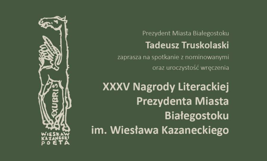 Kapituła nominowała utwory spośród propozycji, które zostały zgłoszone do 35. edycji konkursu. W kategorii „Najlepsza książka roku” zgłoszono 30 tytułów, a w kategorii „Najlepszy ogólnopolski poetycki debiut roku” – 46 tomików. Właśnie według takiego podziału przyznane będą doroczne Nagrody Literackie Prezydenta Miasta Białegostoku im. Wiesława Kazaneckiego.