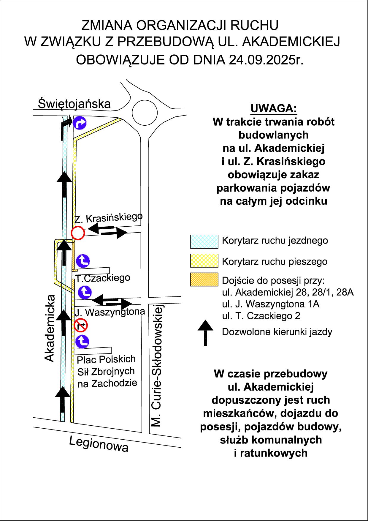 - ul. Z. Krasińskiego na odcinku od ul. Akademickiej do ul. M. Curie-Skłodowskiej – będzie obowiązywał ruch dwukierunkowy bez możliwości parkowania,